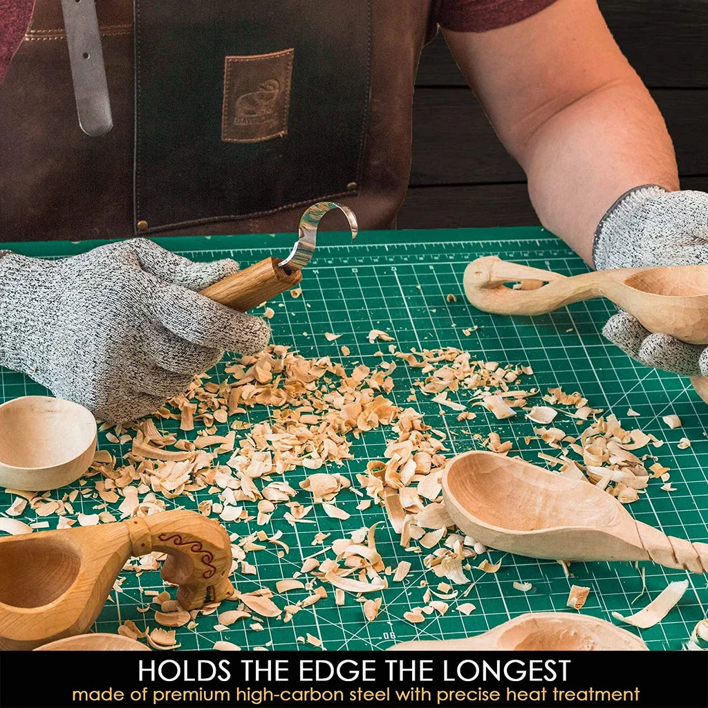 25mm Spoon Carving Knife is an essential tool if you are passionate about spoon carving because by ordering it, you get a hook knife with a hook knife sheath, stylish and made of genuine leather. This small spoon-whittling tool will make anybody feel good about themselves as they carve any concave-shaped project they desire.