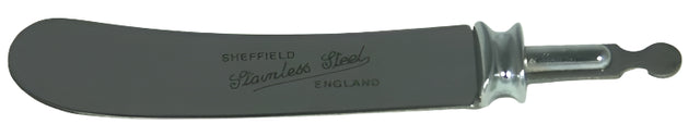 Small Butter/pate knife 18/10 stainless steel made in Sheffield England with bolster. Thickness 0.75mm x 109mm long uses the oval bolster.