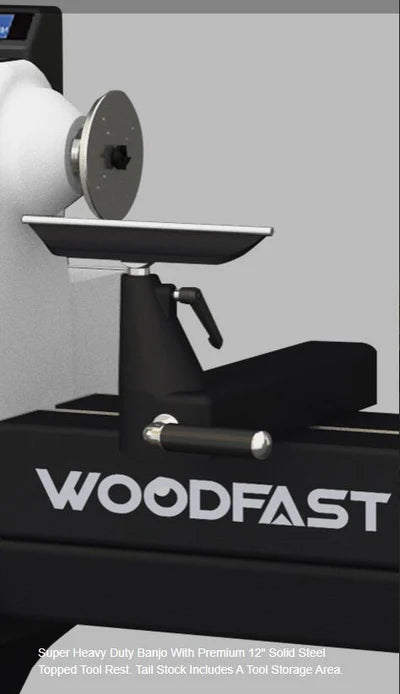 • Super heavy duty banjo with premium 12" solid steel topped Tool Rest.