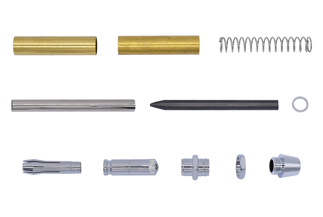 The Toolbox Pencil is perfect for general shop use, sketching and general note taking. The mechanism houses a massive 4 3/4" long, 5.6mm lead that creates a dark line that's easy to see and can be adjusted in or out to expose just the right amount of lead. A sharpener housed in the pencil cap will bring the lead back to a fine point in only seconds. Finished pencil is 4 3/4" long. Minimum blank size: 3/4" x 5". Drill Bit Required: 11mm.