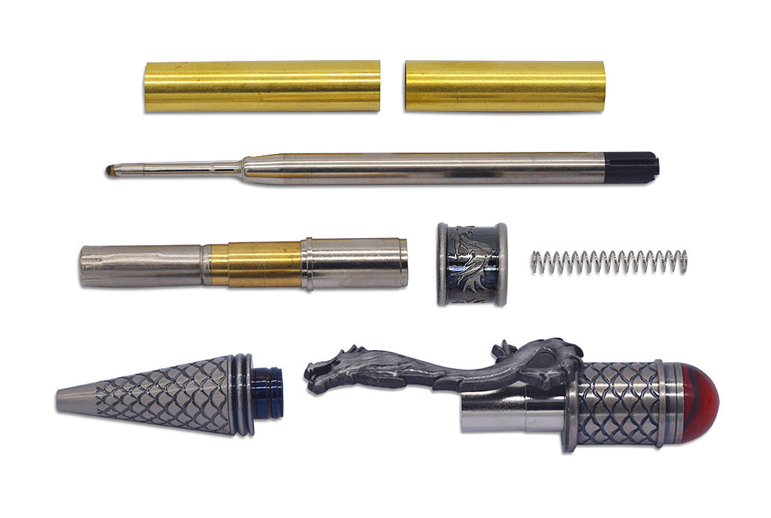 Antique Pewter, loong pen kits. The clip is a full dragon body. The band features double dragon playing a ball. The pen tip and end cap are covered in the Squama of the dragon. Chinese dragons are powerful and benevolent symbols in Chinese culture and are everywhere in China — in legends, festivals, astrology, art, names, and idioms.