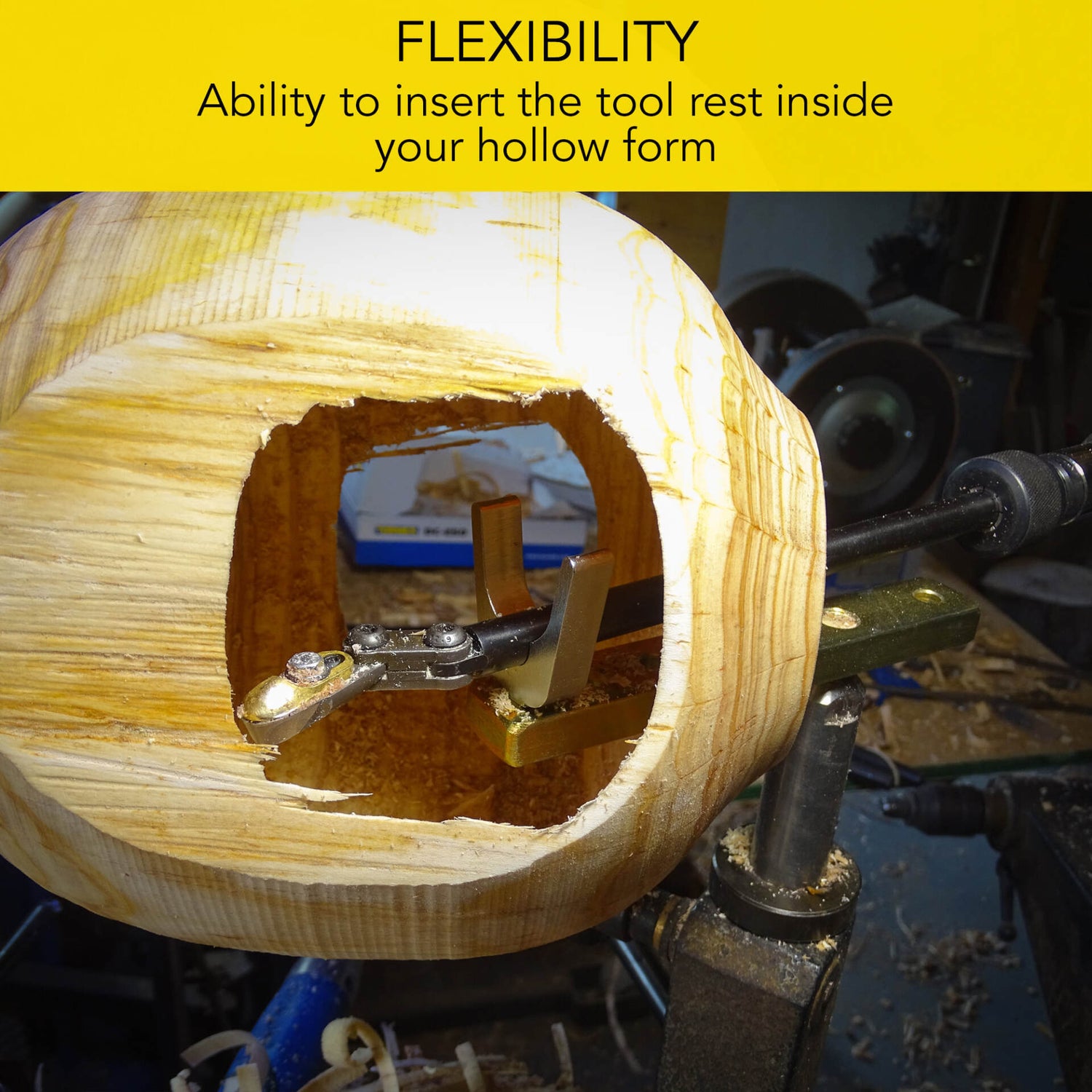 - DEEPER HOLLOWING - Hollow even larger and deeper vessels when using the Irons Tool Gate. This rest can even be rotated and positioned into your vessel enabling deeper hollowing and reducing the, usually, unsupported length of your hollowing tool inside your hollow form. Hollowing of forms up to 19" deep have been achieved with the Irons Tool Gate.