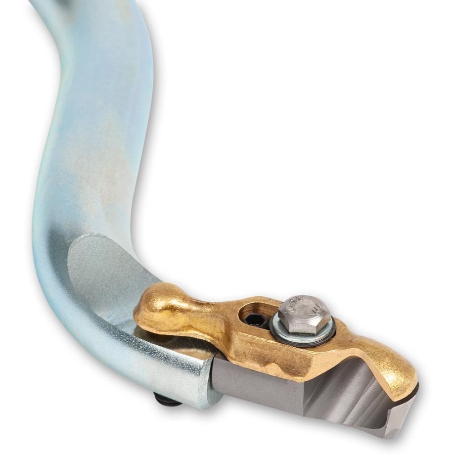 It features a unique parabolic shape, influenced by Parisian textile. This parabolic shape has a narrownose which is uniquely designed to cut end grain cleanly. The large outside curve is designed to cut the face grain on the side of the vessel creating wide shavings. The cutter is specifically designed to release the shavings efficiently, commonly referred to by Phil Irons as the "big exhaust", unlike many of the other hollowing tools on the market with round cutters which create an inefficient 'U" shape exit. The precisely designed bevel is uniquely designed to smoothly and effortlessly produce elegant curly shavings. The cutter is made of M2 HSS and delivered hollow ground. The brass gauge features a crisp edge and can be easily adjusted to control how much wood is cut and to prevent dig-ins.