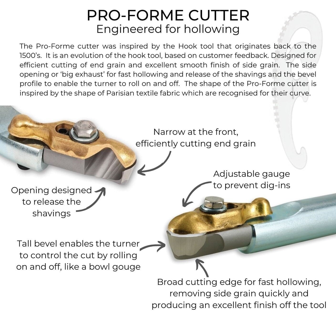 THE PRO-FORME CUTTER HEAD - The Woodcut Tools Pro-Forme cutter head, also known as the Power head, has been specifically designed for hollowing. Woodcut Tools founder, Ken Port, was frustrated by the generic hollowing tool scrapers on the market, so, after many years of design consideration, prototypes and hollowing the Power head cutter was formed.